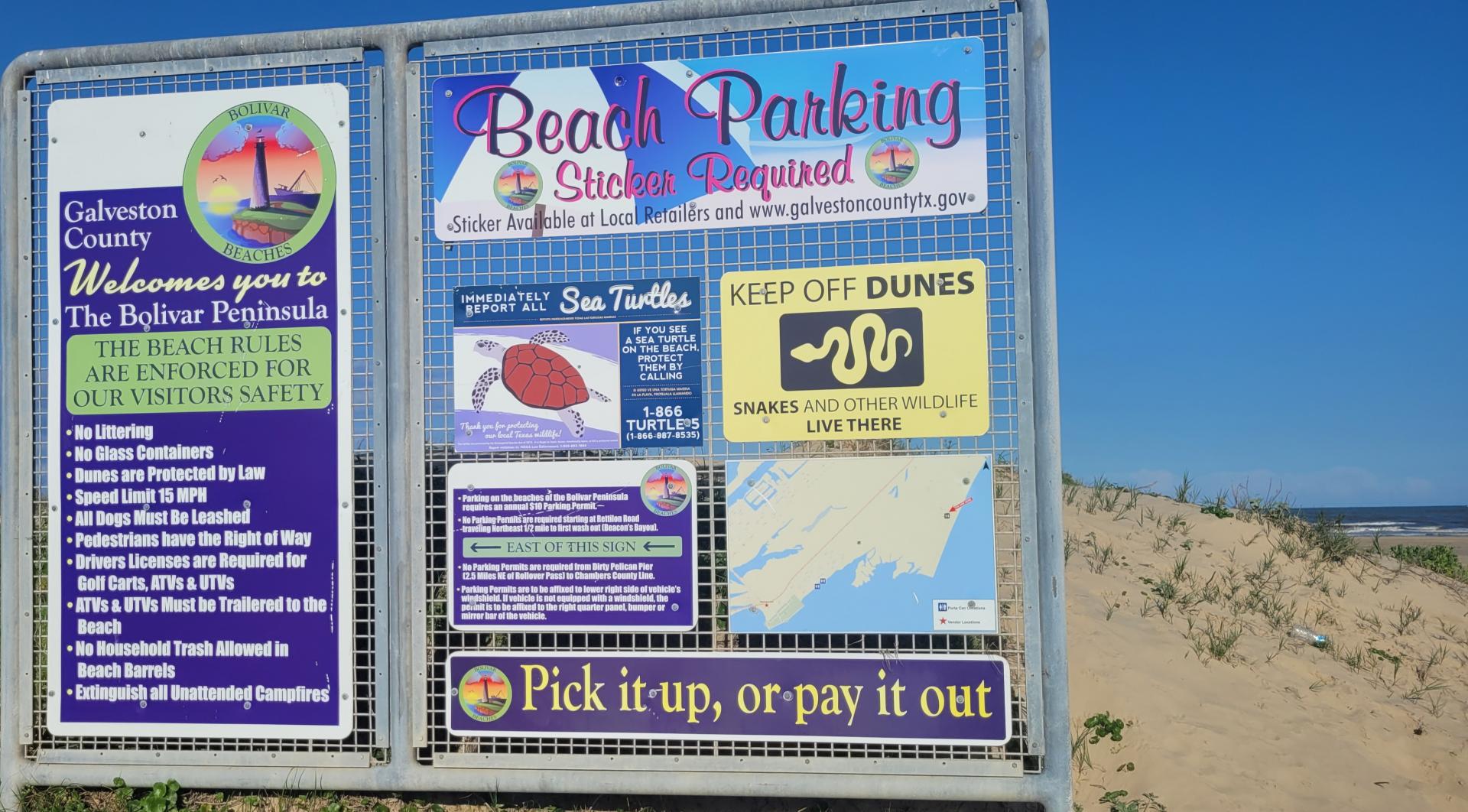 Am Ende der Rettilon Rd. gelangt man auf einen breiten und langen Strand. Die Einfahrt zur Rettilon Rd. liegt ca. 6 Milen vom Fährhafen Galveston-Port Bolivar Ferry entfernt.