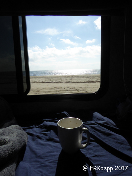 Wir kamen hier Ende März an und das Wetter spielte mit. Auch war der Strand nicht überlaufen. Wir genossen den ganzen Nachmittag ausgiebig bei einem langen Strandspaziergang, Kaffee in den Campingstühlen mit herrlichem Sonnenuntergang.