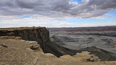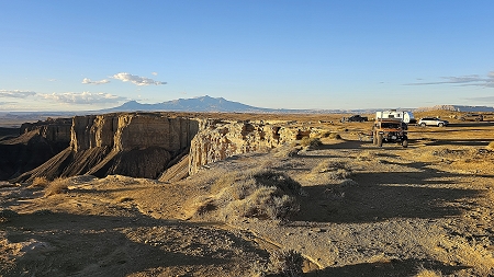 Boondocking auf einer hohen Felsabbruchkante mit Blick auf eine mondähnliche Landschaft, unvergleichlich schön!