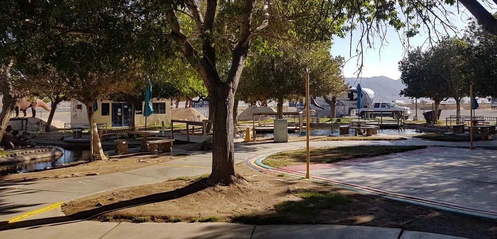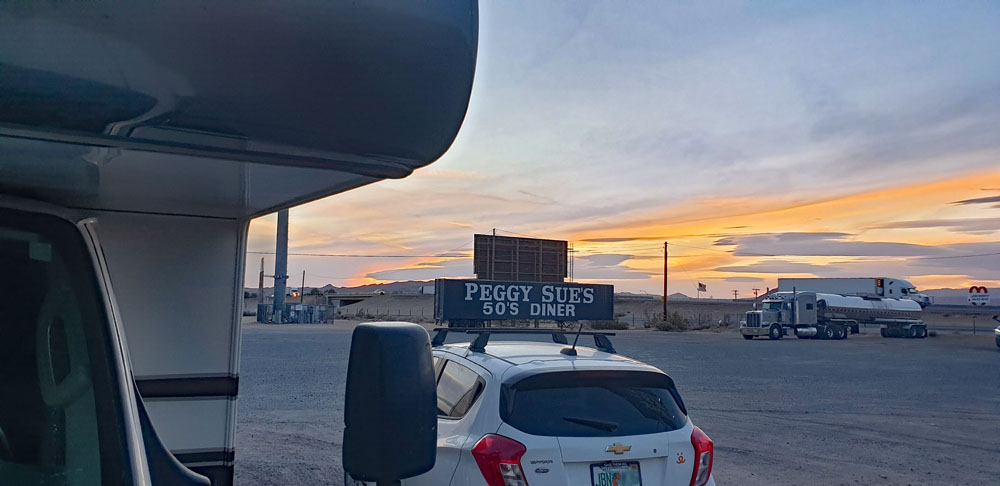 Wahrhaftig kein schöner Platz zum Übernachten, wer aber Lust auf ein gutes Dinner oder Frühstück zu akzeptablen Preisen hat und nicht mehr unbedingt fahren möchte, kann auf den riesigen Truckparkplätze vor dem Peggy Sue’s 50’s Diner ohne Probleme über Nacht stehen bleiben.