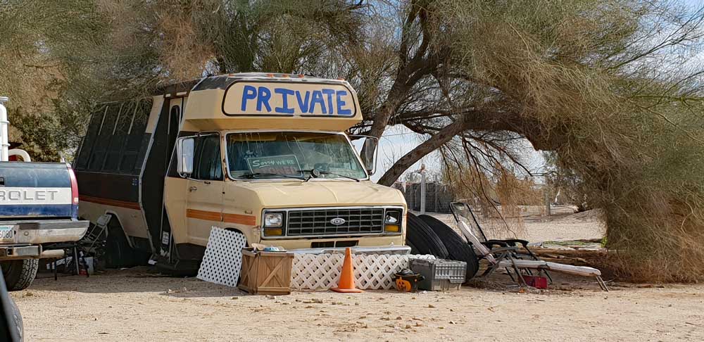 Wildes Leben in der Wüste, Aussteigerparadies, der unkonventionellste Campingplatz in ganz Amerika, oder wie auch immer der Ort beschrieben wird: bekannt ist diese - Stadt kann man kaum sagen - weil sich hier alles trifft, Aussteiger, Künstler, übriggebliebene Hippies in völlig runtergekommenen, vermutlich eher weniger fahrtauglichen Wohngeräten, aber auch ganz normale Touristen mit zum Teil neu- und hochwertigen Wohnmobilen.