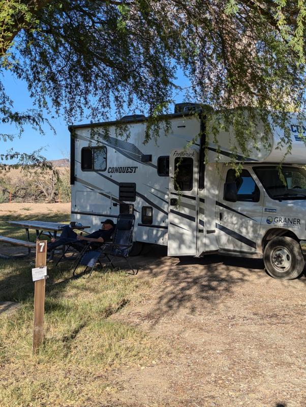 Ich hatte den Campground ein paar Tage vorher online reserviert, der Campground war am späten Nachmittag "full". Uns hat es hier sehr gut gefallen, die Lage unter Cottonwoods ist toll. Wir konnten eine Eule beobachten, die auf dem Campground lebt.