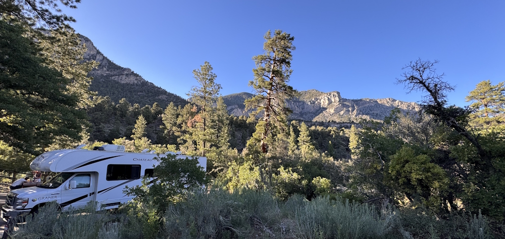 Wir kamen hierher nach einer langen Fahrt (190 Meilen) aus dem Death Valley über Rhyolite und den Hwy-95. Es war schon spät und der freundliche Ranger (Herr über 12 Sites) wies uns gleich am Eingang auf Site #2 ein. Elektro-Anschluss vorhanden. Unter den Bäumen kann man es aufgrund der Höhenlage (7015 ft) sicher auch im Sommer, nur 24 Meilen entfernt von Las Vegas, aushalten.