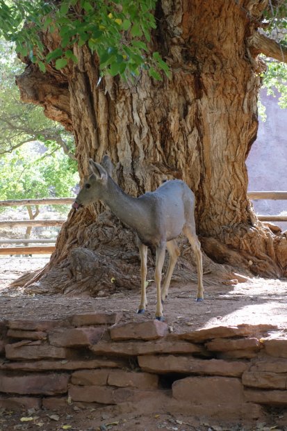 Unser Stellplatz (Site 11) war günstig gelegen, nicht weit vom Fluss, nah am "Gifford House" (unbedingt die super leckeren "Cinnamon Rolls" probieren!) und auch nicht weit von den sauberen Toiletten entfernt. Außerdem ist der Stellplatz riesig, es passen sogar zwei Womo´s locker hinein. Die Site liegt direkt an einer großen Wiese. Der Fremont River selbst war zwar sauber, aber viele Algen deuteten darauf hin, dass die Landwirtschaft weiter oben am Fluss auch Einfluss auf die Wasserqualität hat. Wir waren trotzdem mit den Füßen drin, für mehr war das Wasser einfach noch zu kalt.
