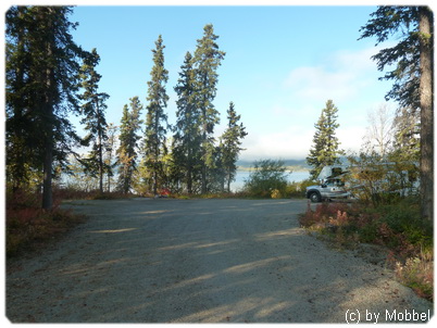 Wir haben den Campground am Dienstag nachmittag und Mittwoch vormittag auf der Durchreise besucht. Der Campground ist kostenlos und wird im Atlin Road Log so beschrieben: "Hitchcock Creek Campground right besides Atlin lake. 6 sites, pit toilets, tables and a gravel ramp for small boats".