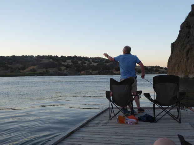 wir haben eine Nacht vom 31.7. auf den 1.8.2011 hier verbracht.Check-In gegen 19 Uhr beim Visitor Center. 23.32$. Wir dürfen uns einen Platz aussuchen. Den unteren Loop finden wir zunächst besser, weil man die Autobanh nicht hört und sieht und es näher am Wasser ist. Hier sind auch die meisten Plätze schon belegt. 2 sehr schöne Sites sind noch frei, sie haben nur den Nachteil, dass wir wenn wir den Hook-Up nutzen wollen, uns so hinstellen müssen, dass wir von innen keine Aussicht auf den Snake River haben. Wir entscheiden uns für den oberen Loop und die Site 13. Das war die Site , die ich mir schon im Reservierungstool angesehen hatte und am liebsten reserviert hätte. Hier hört man die Autobahn und sieht sie auch, dafür ist der Blick in alle Richtungen überwältigend. Die Site ist riesig und weit von allen anderen weg. Wir sitzen noch lange draussen und geniesen den Blick. Heerscharen von American White Pelicans ziehen den Snake River flussaufwärts. Suchen die einen Übernachtungsplatz? Sie kommen immer in Gruppen von 10-20 Vögeln, wir sehen im Laufe des Abends Dutzende Gruppen.