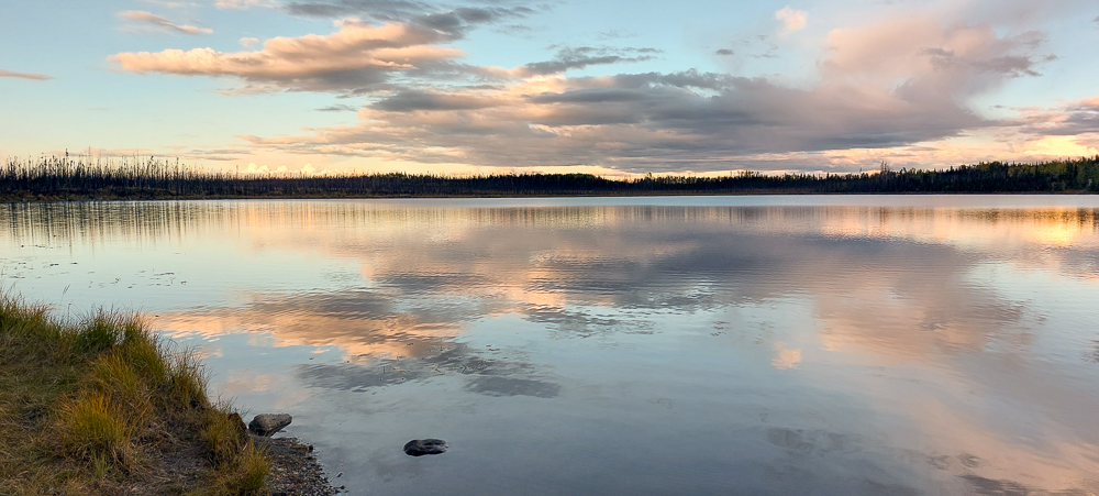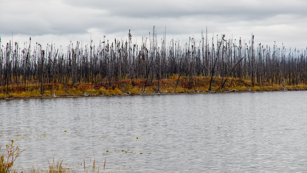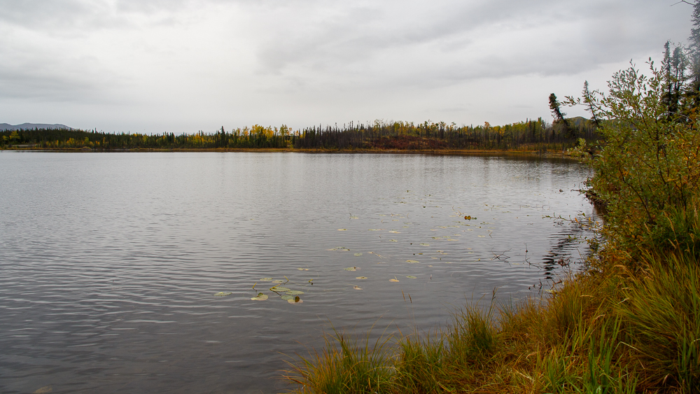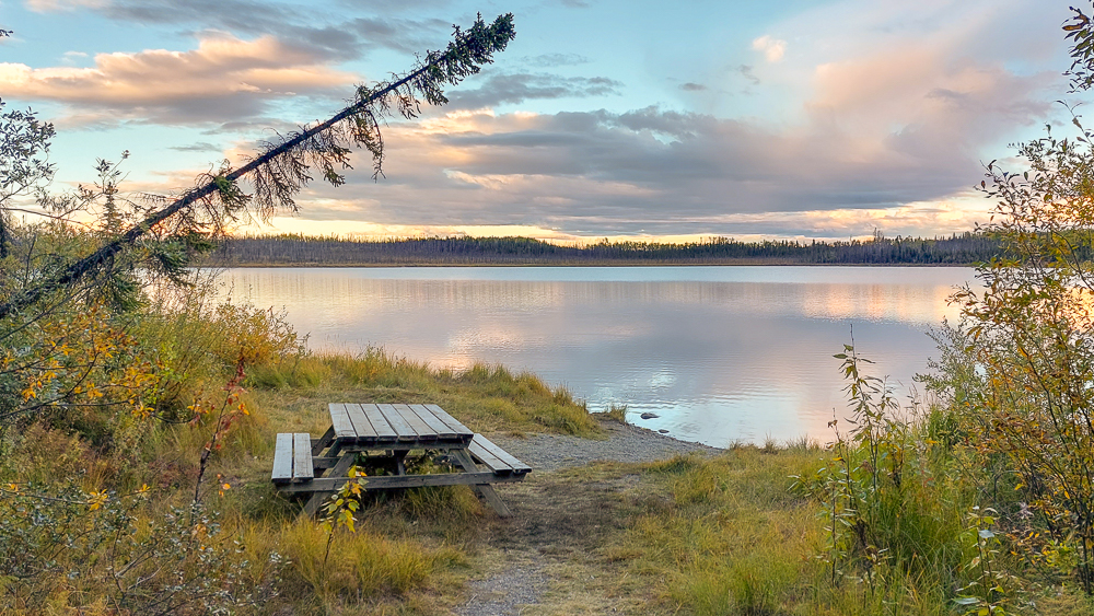 Erst am nächsten Morgen haben wir festgestellt, dass sich ca. 300m südlich des CG eine Abfahrt vom Alaska Highway. befindet. Man kommt hier direkt an den See und findet entlang des kurzen Weges drei schön voneinander getrennt Boondockingplätze.