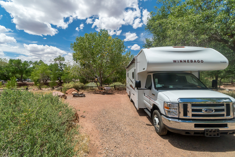 Nur wenige Tage vor unserem Abflug in die USA konnten wir noch eine Riversite auf dem Watchman CG ergattern, die 44R. Wir standen hier am 30. August 2018. Die Site ist riesig und bietet alles: viel Sonne, aber auch schattige Plätze unter den Bäumen; einen Baumstamm zum Sitzen oder Liegen