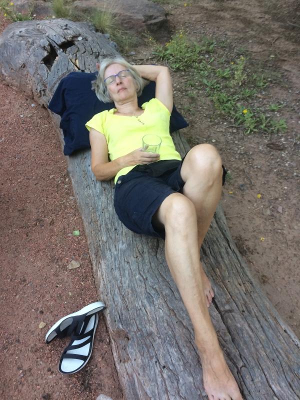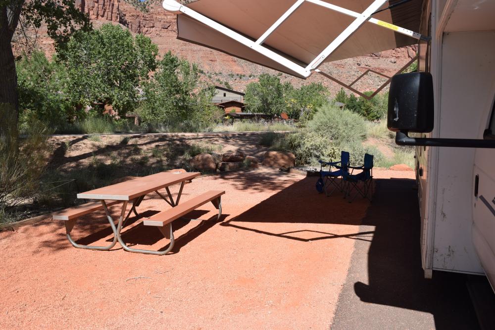 Nur wenige Tage vor unserem Abflug in die USA konnten wir noch eine Riversite auf dem Watchman CG ergattern, die 44R. Wir standen hier am 30. August 2018. Die Site ist riesig und bietet alles: viel Sonne, aber auch schattige Plätze unter den Bäumen; einen Baumstamm zum Sitzen oder Liegen und natürlich Blick auf den Virgin River. Zugang zum Fluss haben alle Camper, aber wir hatten es natürlich näher. Direkt gegenüber der 44 liegt ein Toilettenhäuschen, der Abstand ist aber groß genug, um nicht gestört zu werden. Uns hat es hier sehr gut gefallen, obwohl hier ziemlich viel Betrieb war. Praktisch fanden wir, dass man zu Fuß bis nach Springdale gehen kann (oder auch mit dem Shuttle fahren, wenn man es bequemer haben möchte).