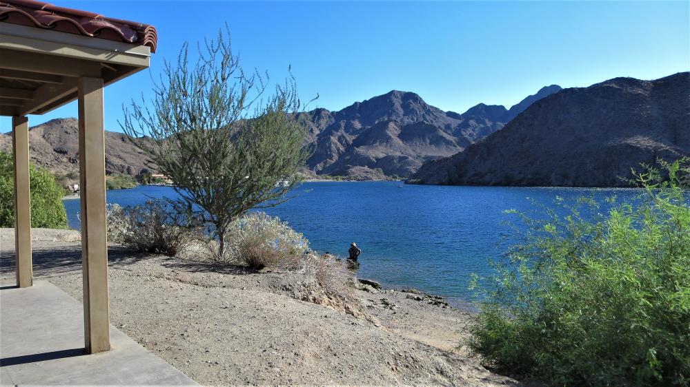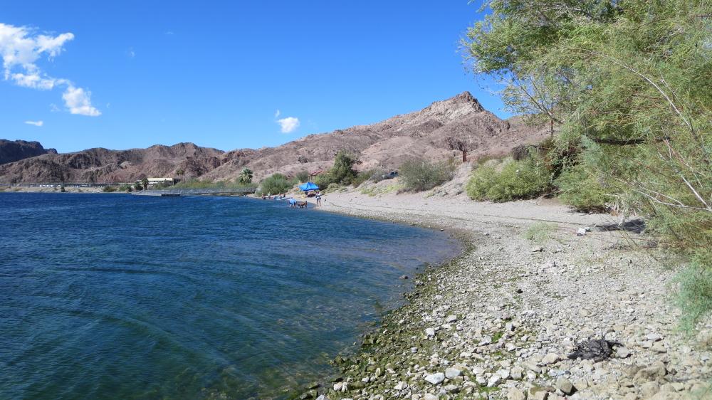 Es führt neben der Site D05 ein"Trail" runter zum Colorado River und zur Marina. Ist nicht weit. Vielleicht 10 Minuten zu Fuß. Also man muss nicht unbedingt mit dem WoMo fahren. Etwas links von der Marina gibt es eine Badestelle. Etwas weiter entfernt nach links oder rechts gibt es jeweils noch eine, wenn wir das richtig gesehen haben. Das Wasser war recht kalt, aber bei der Wärme eine echte Wohltat. Erstaunt waren wir, wie klar das Wasser dort war. Badeschuhe würde ich allerdings empfehlen. Macht es ein bisschen einfacher ins Wasser zu gehen.