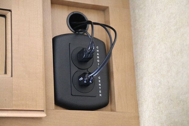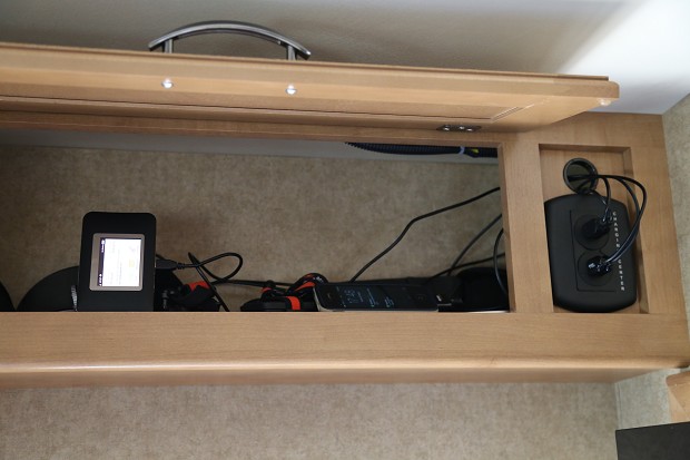 Sehr nützlich finde ich die USB-Charging Station über der Eingangstür: 4 USB-Anschlüsse, die den Strom von den Bordbatterien beziehen. Entsprechend kann man hier Tag und Nacht seine Geräte laden.