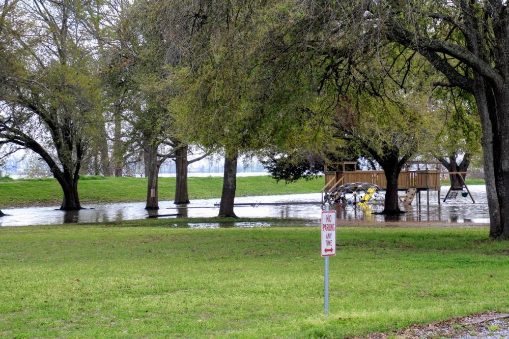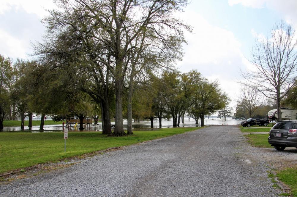Wir beschließen nun zuerst zum Campground zu fahren. Mal sehen ob noch genügend Plätze vorhanden sind, die nicht unter Wasser stehen und ob Torsten schon da ist. Wir fahren über den Mississippi und sind in Louisiana. Unsere Susi führt uns erst mal wieder eine halbe Meile zu weit (die Software), wir haben das Schild zu spät gesehen. Also heißt es wenden und zurück fahren. Inzwischen scheint die Sonne und es ist richtig warm. Wir buchen eine Site und checken die Mails. Karin und Torsten sind noch nicht auf dem Platz, werden aber am Abend kommen.