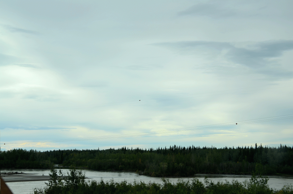 Nach dem Frühstück machen wir uns auf den Weg, erstmal zum Einkauf und dann ab zum Denali NP. Das Wetter ist mal wieder so lala mit Nieselregen. Die Brücke über den Tanana River wird gerade gestrichen und wir haben wieder mal ein „Winkemännchen“ vor uns stehen. Je näher wir dem Denali kommen, desto schlechter wird das Wetter. Teilweise regnet es auf der Strecke dorthin junge Hunde. Zwischendurch geht es mal wieder und als wir im Denali NP ankommen fängt es wieder an zu regnen.