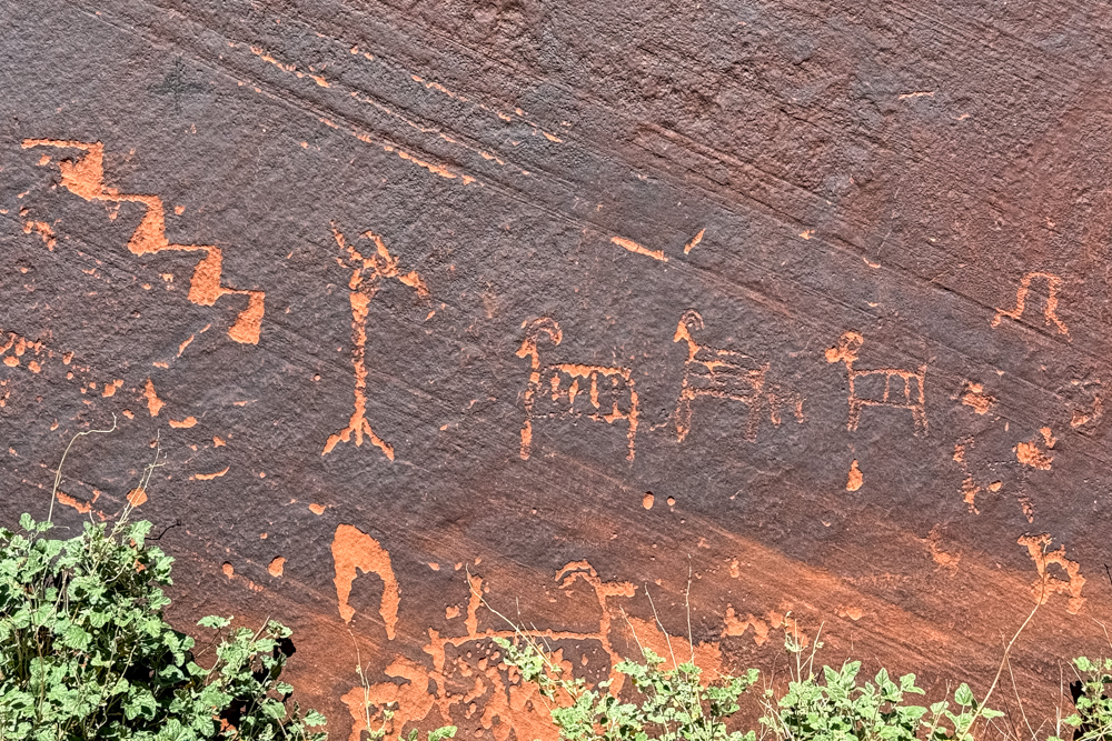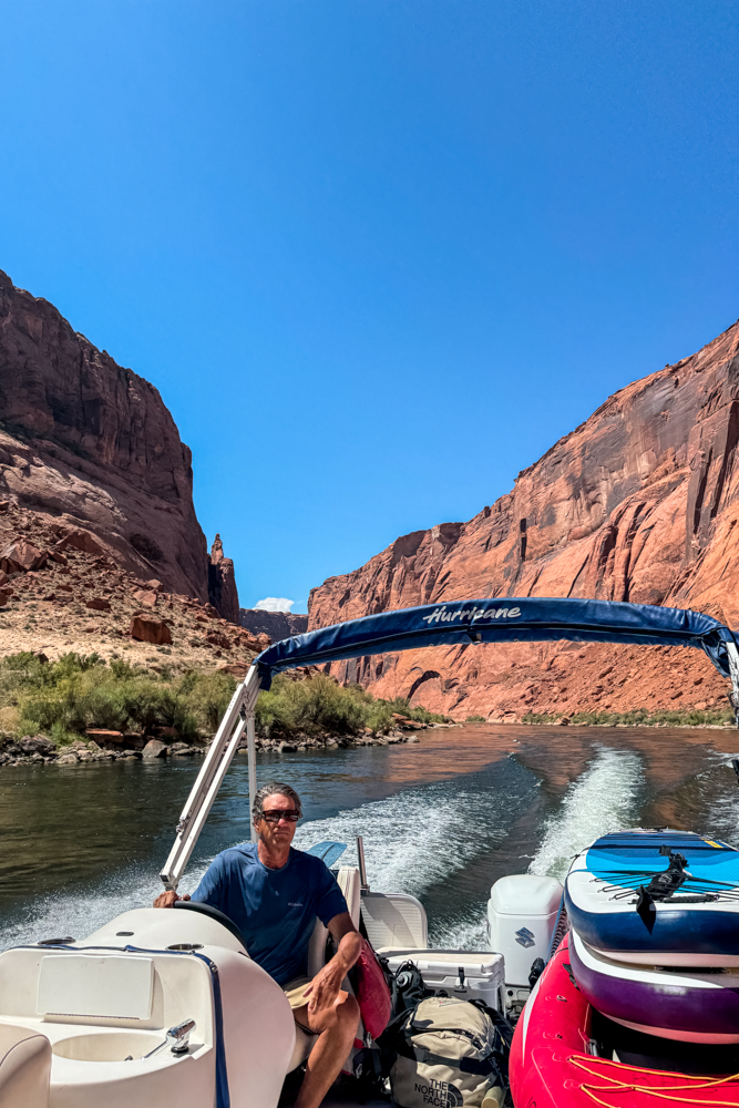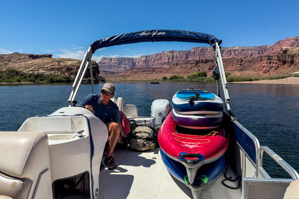 Der Käptn fragt uns, wie lange wir paddeln wollen. Na, so lange wie möglich natürlich. Für die ganze Tour ab dem Glen Canyon Dam reicht uns aber wohl die Zeit heute Nachmittag nicht. Er schlägt vor, uns bei den Petroglyphs abzusetzen, das sei dann eine vier- bis fünfstündige Tour. Wir willigen ein.