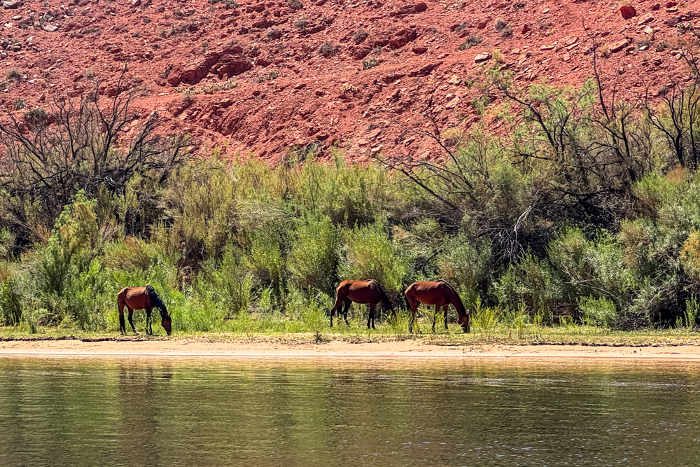 Die Fahrt mit dem Boot stromaufwärts ist schon total beeindruckend und ein Erlebnis für sich. Je weiter wir fahren, desto höher werden die Felswände. Wir bedauern die mageren Wildpferde, die wir unterwegs sehen. Die haben es im Sommer ja auch nicht wirklich leicht. So viel gibts da wohl nicht, woran man sich gütlich tun könnte.