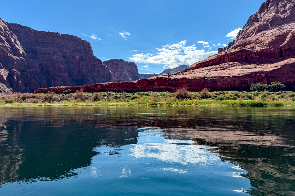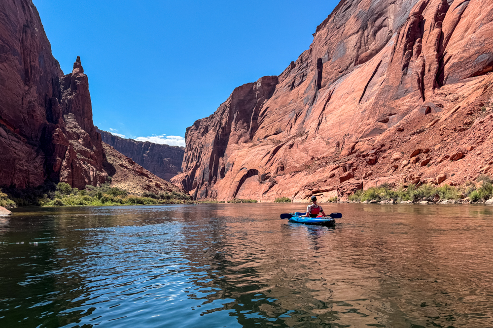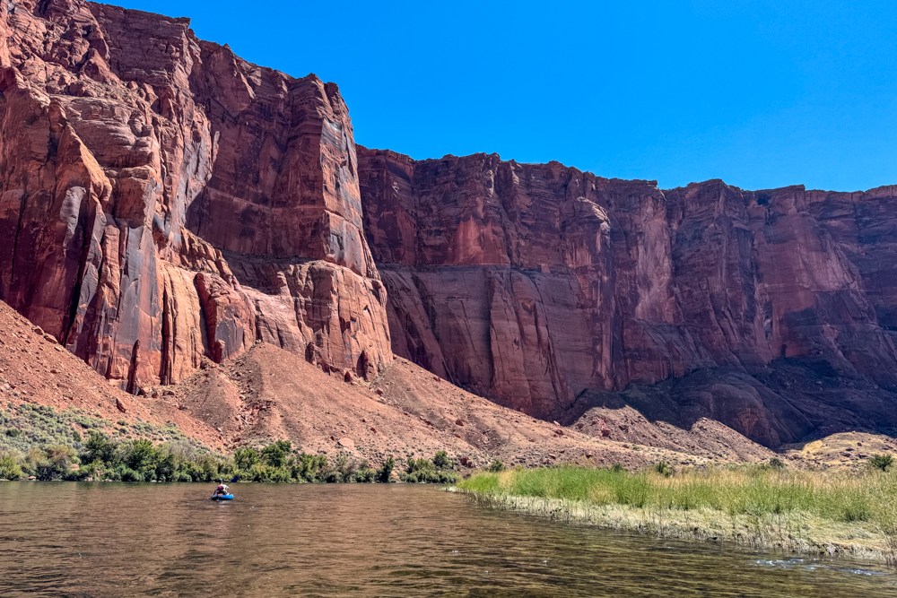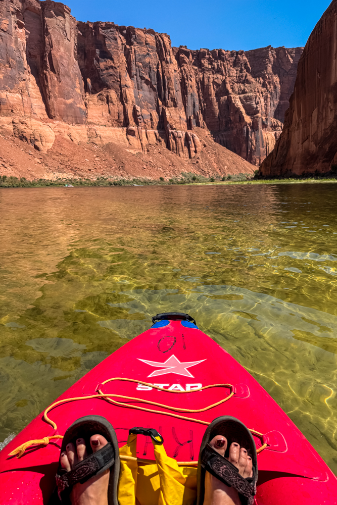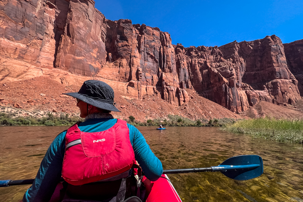 Mal paddeln wir, mal lassen wir uns treiben. Zwischendurch machen wir eine kurze Snackpause, erfrischen uns mit dem eiskalten Wasser des Colorado, herrlich!