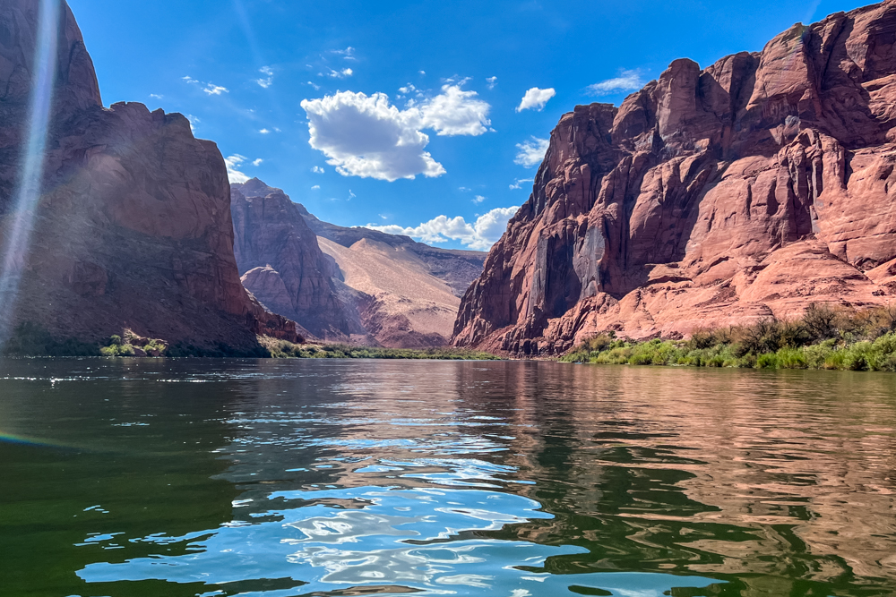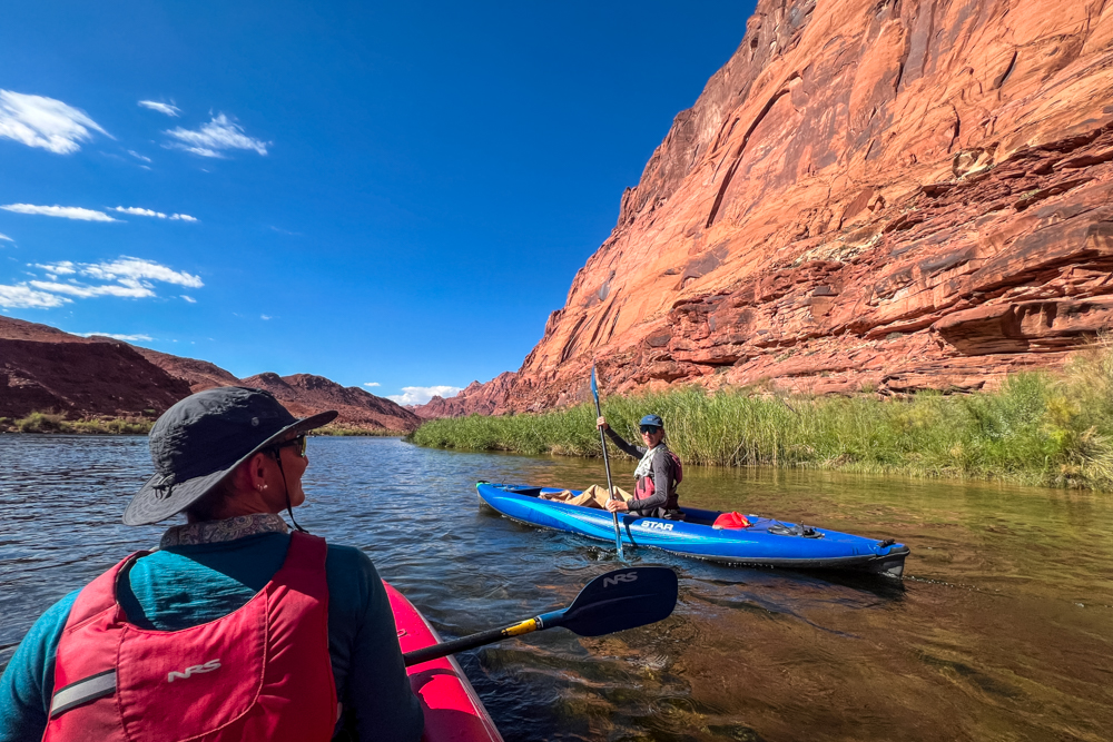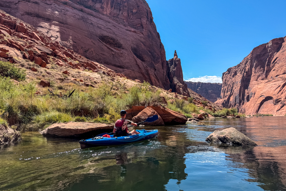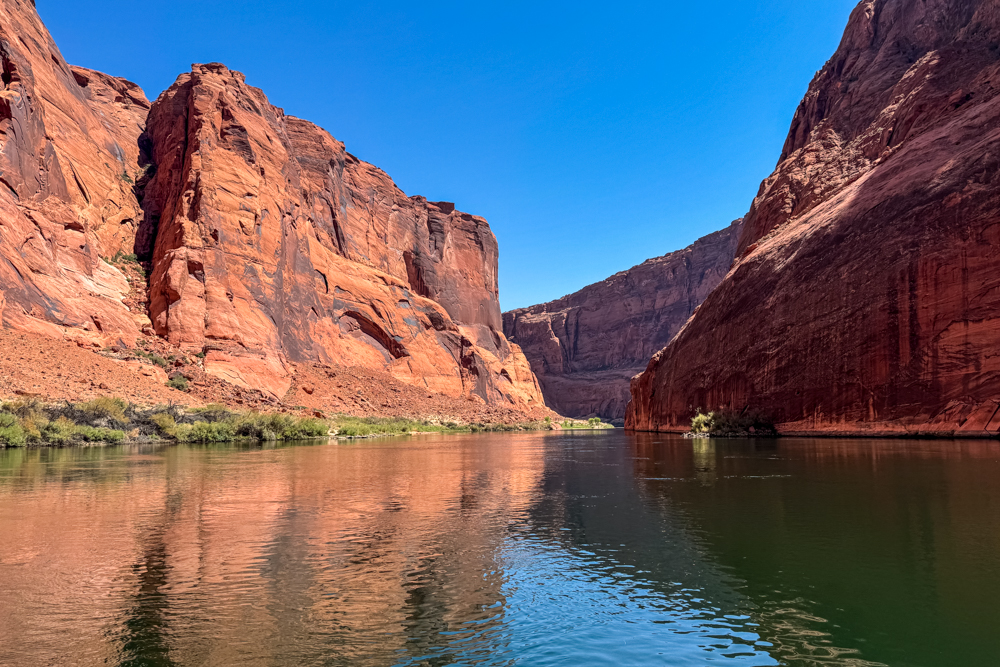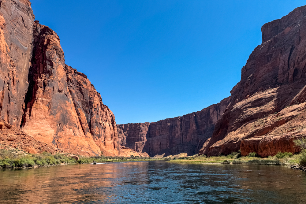 Mal paddeln wir, mal lassen wir uns treiben. Zwischendurch machen wir eine kurze Snackpause, erfrischen uns mit dem eiskalten Wasser des Colorado, herrlich!