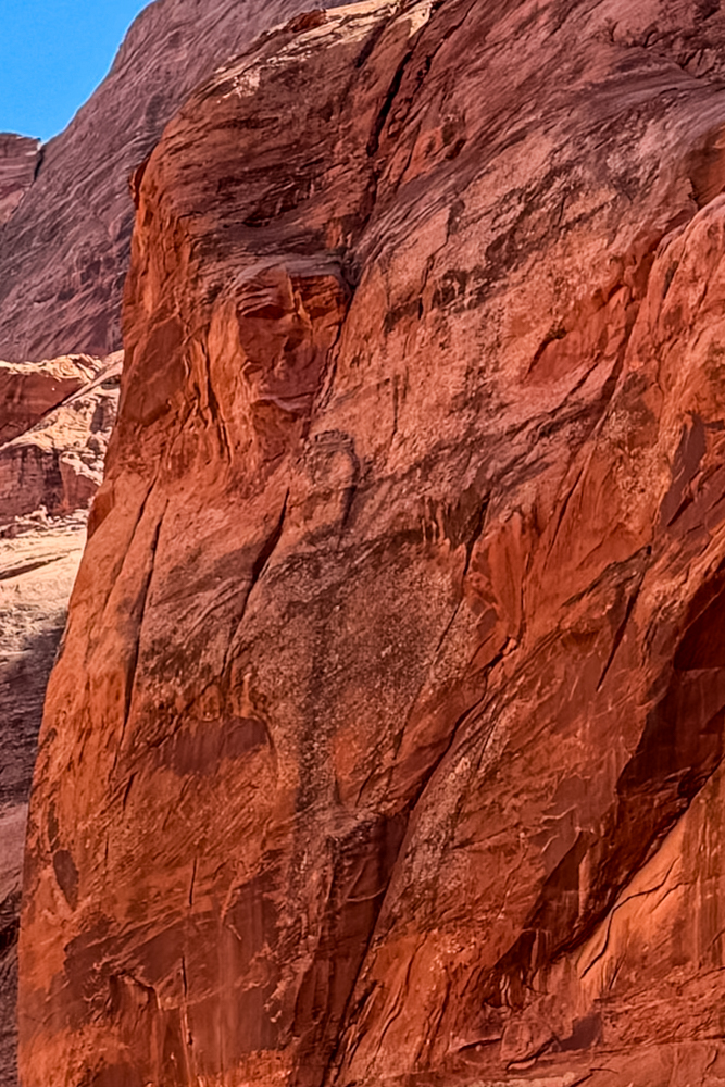 Ein wohlwollend schmunzelndes Gesicht entdecken wir in einem Felsmassiv weit über uns. Vielleicht ist auch wegen der Hitze unsere Fantasie mit uns durchgegangen😜. Oder seht ihr das Gesicht im oberen linken Drittel des Bildes auch?
