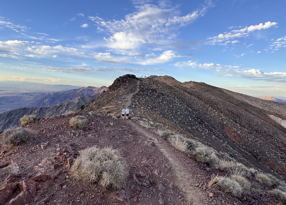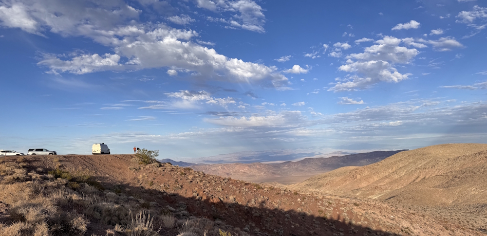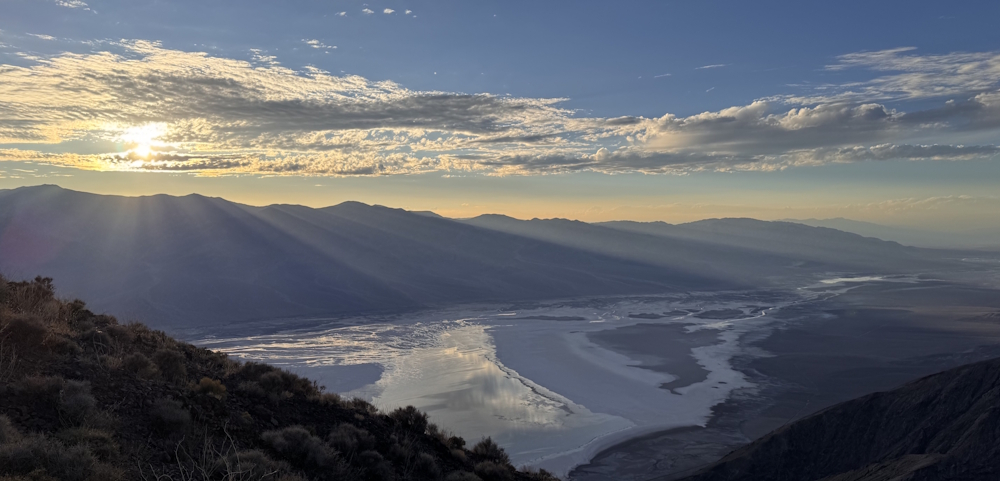 Die Anfahrt dort war gut zu machen, erst die letzte Meile ist doch schon recht kurvig. Oben angekommen hatten wir eine geniale Sicht auf das Death Valley und Bad Water, heute sogar mit „Water“. Hier spazierten wir noch bis zum Ende zum Peak Lookout und konnten uns gar nicht satt sehen. Die versinkende Abendsonne schaffte dabei wunderbare Lichtverhältnisse, ein Träumchen!