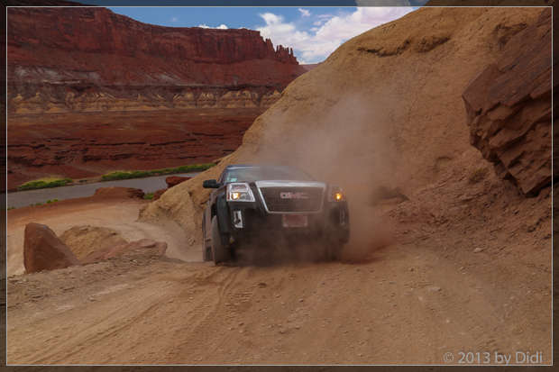 An einer Stelle werde ich fast ohnmächtig (ich war ausgestiegen), als auf einer sehr sandigen Steigung mit Kurve die Reifen durchdrehen, der Wagen zurückrollt und mit der vorderen Schürze am Sandstein entlang schürft (Gott sei Dank keine Kratzer, die Schürze ist aus Kunststoff ohne Lacküberzug). Also zurück auf Los. Erst jetzt entdecken wir, dass es hier eine „Anlaufstelle“ gibt, um den Hügel zu bewältigen. Dort parken wir erst mal und beraten uns. Eins steht fest: die Schürze vorn geht gar nicht! Also packen wir die Plane (Achtung! 2. Verwendungsmöglichkeit) aus und Dietmar legt sich halb unter den Wagen, um mit seinem Leatherman (geniales Werkzeug) kurzerhand das Ding abzumontieren. Geht eigentlich ganz gut – warum sind wir darauf nicht eher gekommen? Die Schürze sicher verstaut im GMC wagen wir es erneut und mit dem Anlauf klappt es auf Anhieb.