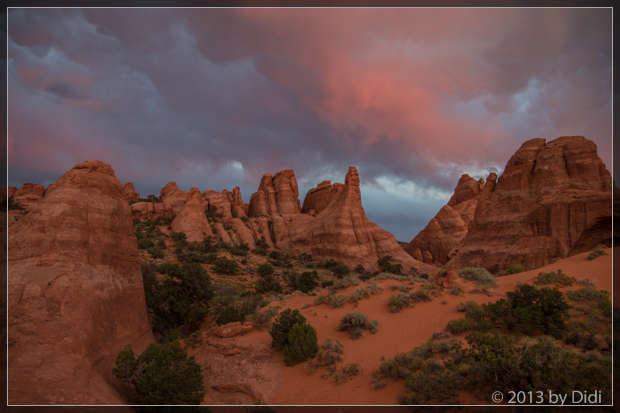 Wir kommen mit nur 2 Std. „Verspätung“ am Horsethief CG an und melden uns kurz beim Host, der die Lage immer noch ganz entspannt sieht. Erst noch den GMC abfegen und duschen, dann verschwinden wir nach Moab, um den GMC zu tanken und mit dem Womo zu dumpen und Frischwasser aufzunehmen.