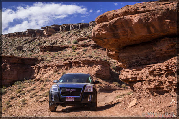 Nach der Radlergruppe kommt noch der Upheaval Bottom, der von dem Ranger als 200 yards Tiefsand beschrieben wurde. Wir gehen die Strecke ab, Tiefsand ist es nicht, aber extreme, wirklich extreme, Spurrillen – da hätte auch echtes High Clearance nichts genützt. Aber man kann ja auf den Kuppen fahren, also mit den rechten Rädern auf dem rechten Rand und den linken Rädern auf der mittleren Kuppe. Diese sind zum Glück sehr fest. Hört sich einfach an, ist aber ziemlich knifflig - zumal man auch noch aufpassen muss, sich nicht den Lack an den Büschen am Straßenrand zu zerkratzen.