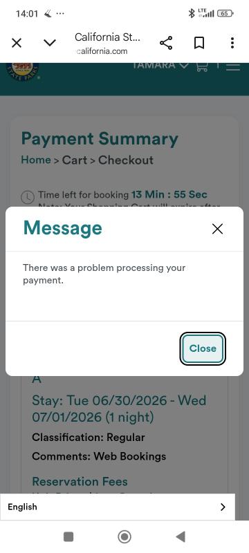 Thank you for contacting Reserve California! I'm sorry to hear you're having trouble paying for your reservation.