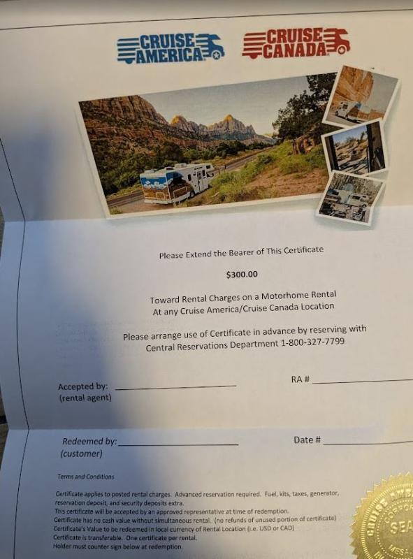 300$ Gutschein für Cruise America abzugeben
