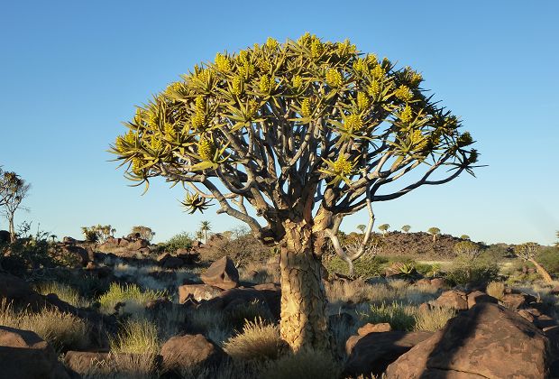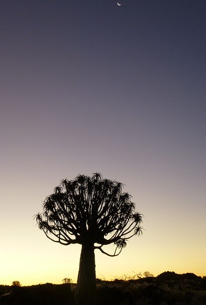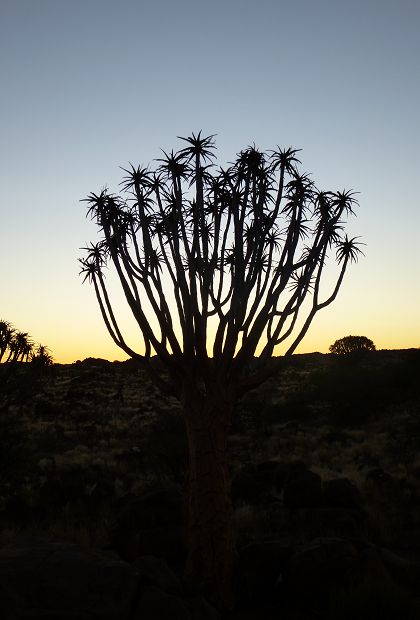 Aber noch war der Tag nicht zu Ende, nach der Fütterung verließen wir wieder das Gehege und steuerten den sog.Köcherbaumwald an. Bei diesem Baum handelt es sich ein bischen um den Nationalbaum Namibias, da dieser nur hier im Land wächst und in der Gegend um Keetmanshop die größten Vorkommen sind. Besonders eindrucksvoll sind dann die Gegenlichtaufnahmen am Abend: