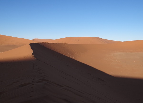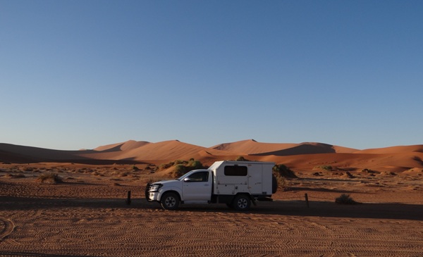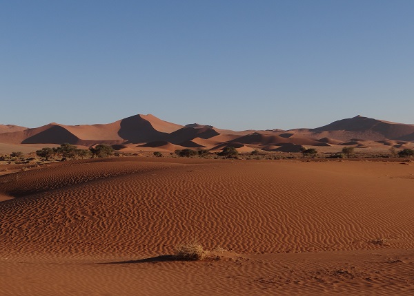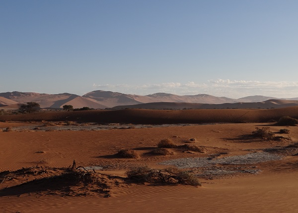 Das Sossusvlei mit den Touristenattraktionen "Dead Vlei und Hidden Vlei" liegt im Namib Naukluft NP und ist eine von Dünen umschlossene Salz-Ton-Pfanne. Dieses Highlight ist nach dem Parkeingang  durch eine ca. 65 km  lange Teestraße vorerst leicht erreichbar. Am Ende der Teerstraße, wo das Hidden Vlei liegt, gibt es dann einen Parkplatz mit einem kostenpflichtigen Shuttledienst - N$ 150 pP - zum Dead Vlei. Denn die letzten 5 Kilometer sind reine Tiefsandpiste und daher darf diese Strecke nur zu Fuß oder mit einem Allradfahrzeug zurückgelegt werden.