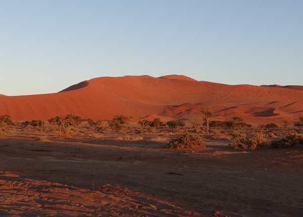 Die Rotfärbung der Dünen beim Sonnenaufgang ist beachtenswert