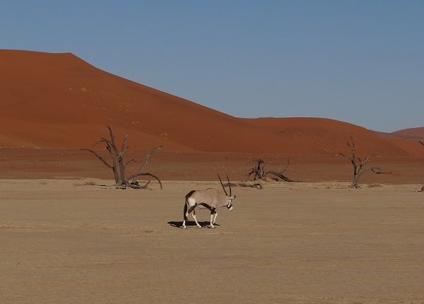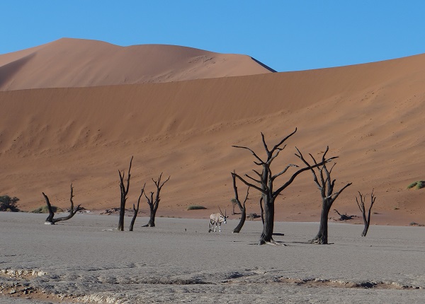 Da uns bekannt war, dass man beim Sonnenaufgang von den hohen Dünen die schönsten Fotos vom Dead Vlei schießen kann, hatte ich nun die für mich gute Idee: "Martina, wir müssen die höchste Düne besteigen".  Doch dieser Vorschlag wurde von meiner besseren Hälfte mit den Worten "Do geh i net aufi, i bin jo ka Berggoaß" kurz und bündig abgeschmettert. Daher gingen wir die 1.1 km unter Mitnahme von Trinkwasser direkt zum Dead Vlei und waren von diesem Highlight total begeistert. Als während unseres Aufenthaltes im Vlei noch ein Oryx daher spazierte - das haben wir bis dato noch nicht erlebt - stieg natürlich unsere Begeisterung und die Kamera klickte im Sekundentakt!