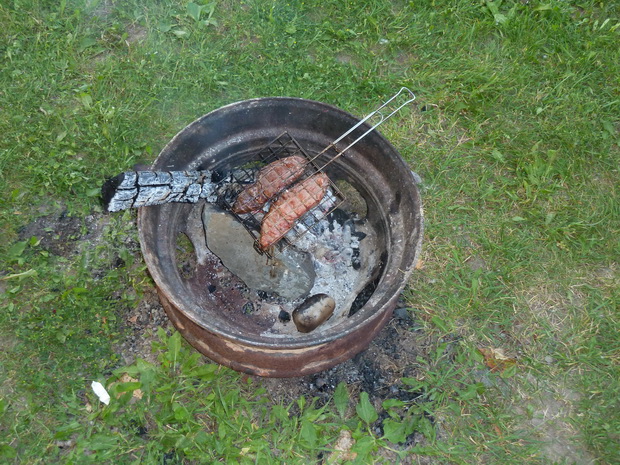 Ach ja, und im Anschluß an das Grillen wird der Rost hochgeklappt und auf die Kohlen kommt das Feuerholz für das Lagerfeuer.