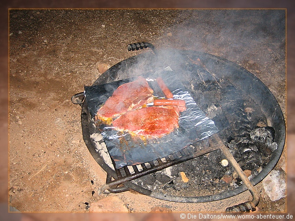 Die Feuerstellen haben in der Regel ein Grillrost. Ich würde jedoch Aluschalen benutzen. Grillkohle gibt es in den Supermärkten, Holz meist auch auf den Campgrounds zu kaufen. Holz sammeln ist in der Regel verboten.