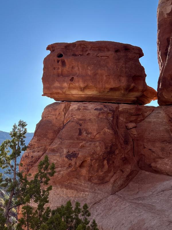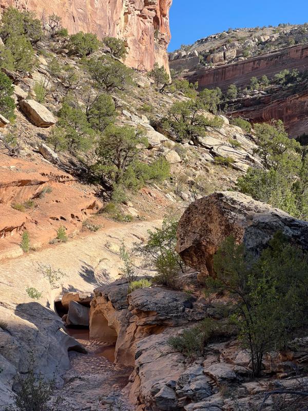 Da unser Sohn morgens durchhing, fiel die große Wanderung leider aus. Wir sind vom CG dann zum Visitor Center und von dort über den Canyon Rim und Window Rock Trail zurück. Hier hat man tolle Ausblicke in den Canyon. Mittags wurde es recht heiß, da haben wir uns in Fruita eine Pizza gegönnt. Nachmittags sind wir dann erst den Echo Canyon Trail gewandert, in der Hoffnung, dass es dort kühler ist. War es leider nicht wirklich, man läuft recht lange über Slick Rock bergab in der Sonne. Danach sind wir noch zu Devils Kitchen gelaufen. Im Licht der tiefstehenden Sonne sahen die Felsen einfach wunderschöne aus.