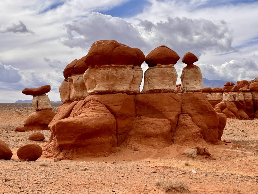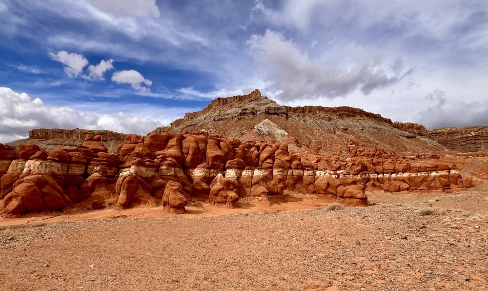 Diese Mischung aus Goblins und Hoodoos hat Ähnlichkeit mit denen im Goblin Valley, jedoch mit einer zusätzlichen Weiß-Streifung, was den Gesteinsformationen nochmals eine zusätzliche besondere Note verleiht.