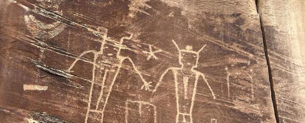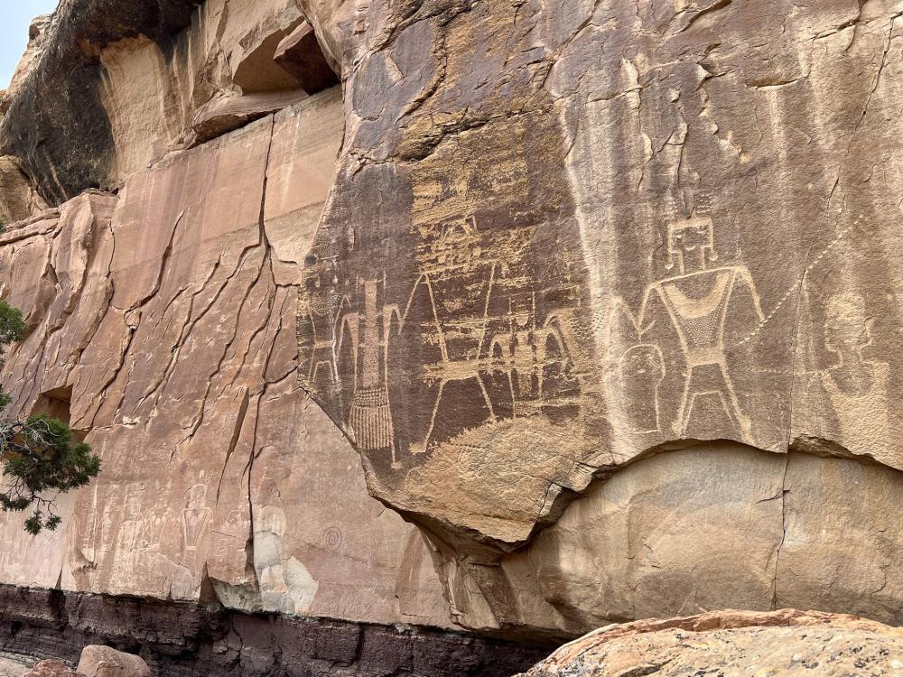Dutzende von Petroglyphen und Piktogrammen, viele kompliziert und gut erhalten, erstrecken sich fast eine Meile über eine Linie von nach Süden ausgerichteten Sandsteinfelsen im Tal von Dry Fork Creek; eine der besten Felskunst-Lage in Utah. Auf privatem Land, aber für die Öffentlichkeit für eine kleine Spende zugänglich. -- Sie stammen aus der Fremont-Kultur, ca. 1200 n.Chr.