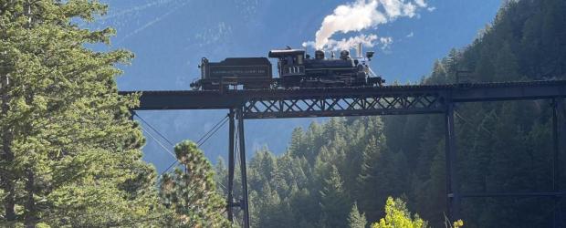 Die Kettle Valley Steam Railway fährt von der Prairie Valley Station zur Trout Creek Trestle Bridge und zurück. Fahrzeit ist 90 Minuten regulär oder 2 Stunden mit Zugüberfall.