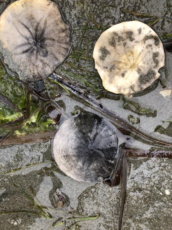 Naja, halb so wild, der Rathtrevor Beach ist auch bei Ebbe toll. Als wir um elf den Platz verlassen müssen, fahren wir zum Day Use-Bereich und gehen da erst einmal eine Weile im Watt spazieren. Da es ziemlich wolkenverhangen und auch nicht allzu warm ist, ist auch keiner traurig, dass man heute nicht schwimmen kann. Füße ins Wasser und Krebse, Muscheln und seltsame Meerestiere bestauen macht auch Spaß.