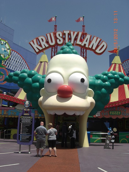Nach der Tour sind die Simpsons an der Reihe. Zuerst im „Kwik- E- Mart“ einige Souvenirs gekauft und dann zum „Krustyland“. Die 3D Bahn ist auch klasse J Wir haben noch die „Jurassic Park“ Bahn und die „Transformers“ Bahn besucht bevor wir uns noch ein paar Shows ansehen. Das „House of Horror“ darf auf der Liste natürlich nicht fehlen. Jasmin hat sich zwar schon den ganzen Tag davor gedrückt, aber da es bis zur letzten Show noch eine dreiviertel Stunde ist, müssen wir ja irgendwie die Zeit überbrücken. Es ist so dunkel dort, dass wir nicht einmal sehen wohin wir gehen und laufen andauernd gegen die Wände. Es ist total zum Gruseln. An fast jeder Ecke springt jemand raus, „Haare“ hängen von oben runter und wir müssen an der Decke aufgehängte  „Leichen“ zur Seite schieben um vorbei zu kommen. Während der „Stunt Show“ hat Jasmin dann Zeit den Schreck zu verdauen J Danach machen wir uns auf den Weg zurück zum WoMo und bummeln noch etwas in der Fußgängerzone.