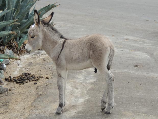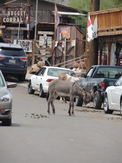 So sind wir heute also schon um halbsechs aufgestanden, unabsichtlich. Nachdem der nette CG-Mitarbeiter unseren Gastank aufgefüllt hat, treten wir die lange Fahrt zum Joshua Tree NP an. Um die ziemlich gleichförmige Strecke aufzulockern, verlassen wir die Interstate 40 beim Exit nach Oatman und fahren ein Stück die alte Road 66. Es geht durch karge Wüstenlandschaft in noch trockeneres Bergbaugebiet nach Oatman, das von Souvenirständen im Wildwest-Look und freilaufenden Eseln lebt. Im Schatten zeigt das Thermometer 42° an.