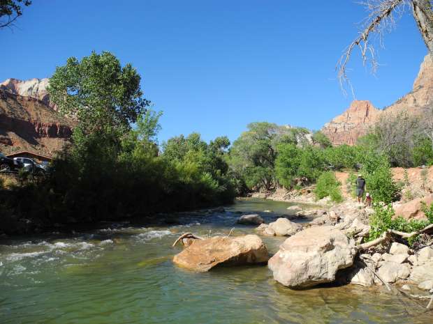 Hatten einen Riverside Platz auf dem Watchman CG, total toll! Die Kids haben gleich ein Erfrischungsbad genommen, danach zum Visitor Center und mit dem Shuttle Service zur Zion Lodge. Von dort aus Spaziergang an den Emerald Pool (hatte noch ein wenig Wasser) und den Kayenta Trail gelaufen.
