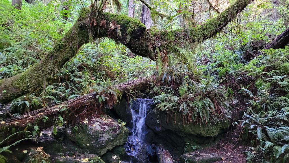 Nach wenigen Meilen biegen wir rechts vom Highway ab und steuern den (riesigen) Parkplatz inkl. Plätzen für Oversized Vehicle unseres letzten Hikes hier im SP an, der mit rund 2,5 Meilen knackige Trillium Falls Trail. Der Funke mag jedoch nicht recht überspringen, vielleicht haben wir in den letzten Tagen einfach zu viel Farn und Grün gesehen und sind mittlerweile abgestumpft, doch der namensgebende „Wasserfall“ ist so wenig beeindruckend (jop, das nachfolgende Foto zeigt ihn ... 😊), dass wir den Rundkurs nach dem vermeintlichen Highlight des Trails und einem Drittel abbrechen und unseren Fußspuren zurück zur Womoline folgen.
