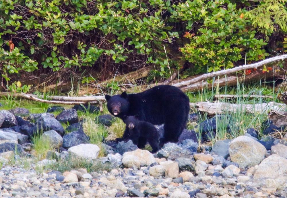 Da unsere Kids noch zu klein sind für die Zodiac Boote, fahren wir mit einem der anderen Boote raus. Das Wetter ist immer noch traumhaft und so geniessen wir eine wunderschöne Bootsfahrt durch die Inselwelt von Tofino. Alleine für diese grandiose Landschaft lohnt sich die Tour. Mami ausgerüstet mit der Kamera und die Kids mit Ferngläsern. Leider scheint das warme Wetter den Bären weniger zu gefallen und so langsam wird unser Guide nervös, da wir noch keine Bären gesehen haben. Aber dann bekommt er den entscheidenden Hinweis von einem anderen Tourboot und wir fahren zur entsprechenden Stelle. Und tatsächlich in einer schattigen Bucht entdecken wir unseren ersten Schwarzbären – was sag ich – unsere ersten 2 Schwarzbären. Es ist eine Bärenmutter mit ihrem Jungen. Die Kids sind ganz aufgeregt und auch wir freuen uns tierisch über unsere ersten wildlebenden Bären. Es ist toll diese Tiere in der Natur zu erleben. Süss wie der kleine Bär seine Mutter nachahmt und unter den Steinen nach Nahrung sucht. Zu nahe ran können wir mit unserem Boot nicht (die Zodiacs können etwas näher). Wobei auch die Zodiacs nicht zu nahe an die Tiere ranfahren. Das gefällt mir sehr an dieser Tour - das wohl der Tiere steht an oberster Stelle und man ist sehr bedacht darauf, die Tiere nicht zu verschrecken oder gar bedrängen. Irgendwann verschwindet das Jungtier im Wald – ein Zeichen, dass sich das Muttertier nicht mehr ganz so wohl fühlt und den Nachwuchs in Sicherheit bringt und so eintscheidet der Guide weiterzufahren. Ein paar Minuten später, entdecken wir noch eine Bärin mit zwei Jungen – jedoch weit entfernt. Unser Guide versucht sich den Tieren zu nähern – allerdings haben wir einen kleinen Gast an Board, der die Tour nicht ganz so toll findet und lauthals am quängeln ist. Wir wollen die Tiere nicht verscheuchen – zumal schon ein Zodiac dort ist und die Tiere beobachtet und so fahren wir weiter. Schade, aber wir haben ja selber kleine Kinder und somit Verständnis für die Situation - ist ja auch nicht so, das wir deswegen keine Bären gesehen hätten. Wir fahren nochmal zur Bucht, wo wir vorhin die Bärin mit dem Jungtier gesehen haben. Die Bärin ist immer noch dort - aber ohne Jungtier und so bleiben wir nur kurz, um sie nicht weiter zur stören. Unser Guide möchte uns unbedingt noch den ein oder anderen Bären zeigen – und deshalb fahren wir weiter die Küste ab – obwohl es längst Zeit für die Rückkehr wäre – allerdings habe wir heute kein Glück mehr. Auf dem Rückweg fahren wir noch an einigen Robben, die auf den Felsen liegend den Sonnenuntergang geniessen und einem Weisskopfseeadler vorbei. So verlängert sich die Tour um ca. eine Stunde. Unser Guide hat einen tollen Job gemacht und wusste jede Menge über die Natur und Tiere in Tofino zu berichten. Wir können die Tour definitiv empfehlen. Es ist spät und so machen wir uns auf den Weg zurück zum Greenpoint Campground. Auch heute haben wir das mit dem Feuerholz wieder verpasst und so gibt’s rasch was aus der Pfanne und dann ab ins Bett.