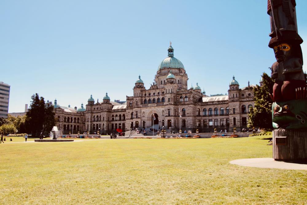 Um 7 Uhr klingelt der Wecker und wir fahren direkt ohne Frühstück los Richtung Victoria. Heute passt das Wetter wieder und die Sonne lacht. Wir geraten etwas in den Berufsverkehr um Victoria und finden um ca. 9.30 Uhr einen Parkplatz. Die Parkplatzsuche in Victoria war nicht ganz einfach. Rund um die Tourist-Info im Zentrum war Baustelle und kaum die Möglichkeit einfach anzuhalten und so kurven wir im Zentrum rum. Die meisten PP hier sind nicht erlaubt für Womos und ohnehin schon gut gefüllt. Dann entscheiden wir uns etwas raus aus dem Zentrum zu fahren. Ganz in der Nähe vom Kreuzfahrtschiffhafen parken wir dann am Strassenrand der Dallas Road. Hier stehen schon einige andere Womos und wir fragen noch kurz eine Anwohnerin, ob hier Parken denn ok sei – was sie bejaht. Dann machen wir uns zu Fuss in Richtung Zentrum.