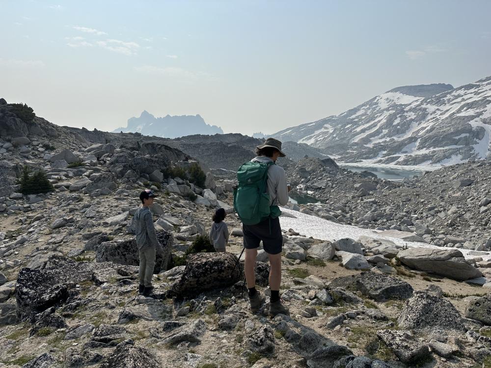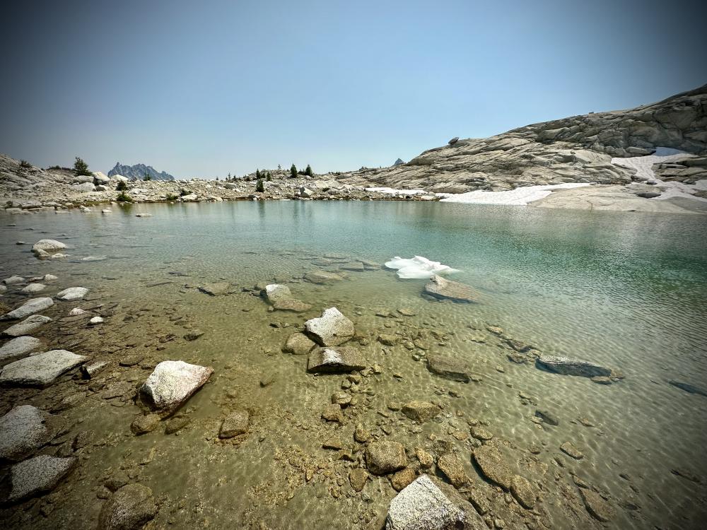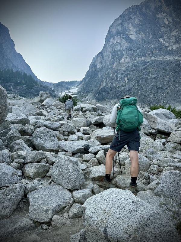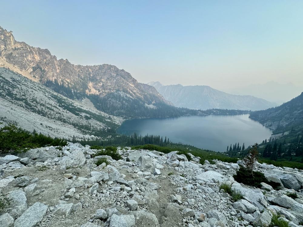 Ich wache gegen 3/4 Uhr morgens auf….und ich rieche Rauchsurprise Der Blick nach draussen bestätigt, es ist ziemlich dunstig/rauchverhangensurprise Ein komisches Gefühl macht sich breit...hier draussen, allein, im Waldsurprise Aber naja wir sind hier an der Baumgrenze (also nicht viel Treibstoff für ein Feuer), direkt am See und würde es in der Nähe brennen, wäre ja bestimmt schon die Kavallerie ausgerückt um uns zu retten...hoffentlichsurprise  Ausserdem wusste ich ja, dass das passieren kann. In Leavenworth hatte ich ja bereits entsprechende Meldungen von Wetterapps erhalten - Air Quality Alert! Als etwas später die ersten Thru-Hikers am Zelt vorbei laufen, bin ich beruhigt. Das Feuer ist also definitiv nicht hier in der Nähe, sonst wären die gar nicht erst gestartet. Trotzdem mach ich mir Sorgen. Nicht wegen dem Feuer….aber der Rauch…und der anstrengende Aufstieg am Aasgard Pass…keine gute Kombisurprise Naja warten wir ab, ich döse erst mal weiter. Wir stehen etwas später auf als geplant - erst gegen 5.30 Uhr und starten den Hike um 6.30 Uhr. Es ist immer noch leicht rauchverhangen aber nicht schlimm. Wir riechen den Rauch zwar, aber es ist nicht so, dass es in den Augen brenne würde oder wir gar Mühe beim Atmen hätten...phuuu Gott sei Dank.  Trotzdem hoffen wir natürlich, dass der Rauch sich im Lauf des Tages ganz verziehen wird...aber vor allem nicht schlimmer wird. Von unserem Zeltplatz aus stehen wir in wenigen Minuten am Anfang des Aasgard Passes. Hier gibt es keinen eigentlichen Weg mehr. Wir wissen, dass wir uns links vom Wäldchen weiter oben (jetzt sind wir davon noch weit weit entfernt) halten müssen. Rechts davon ist ein Bach und gefährlicher Wasserfall, der oft auch bis in den Sommer hinein noch teilweise unter Schnee verborgen liegt. Diese Route ist unbedingt zu vermeiden und hat leider auch schon Tote gefordert.