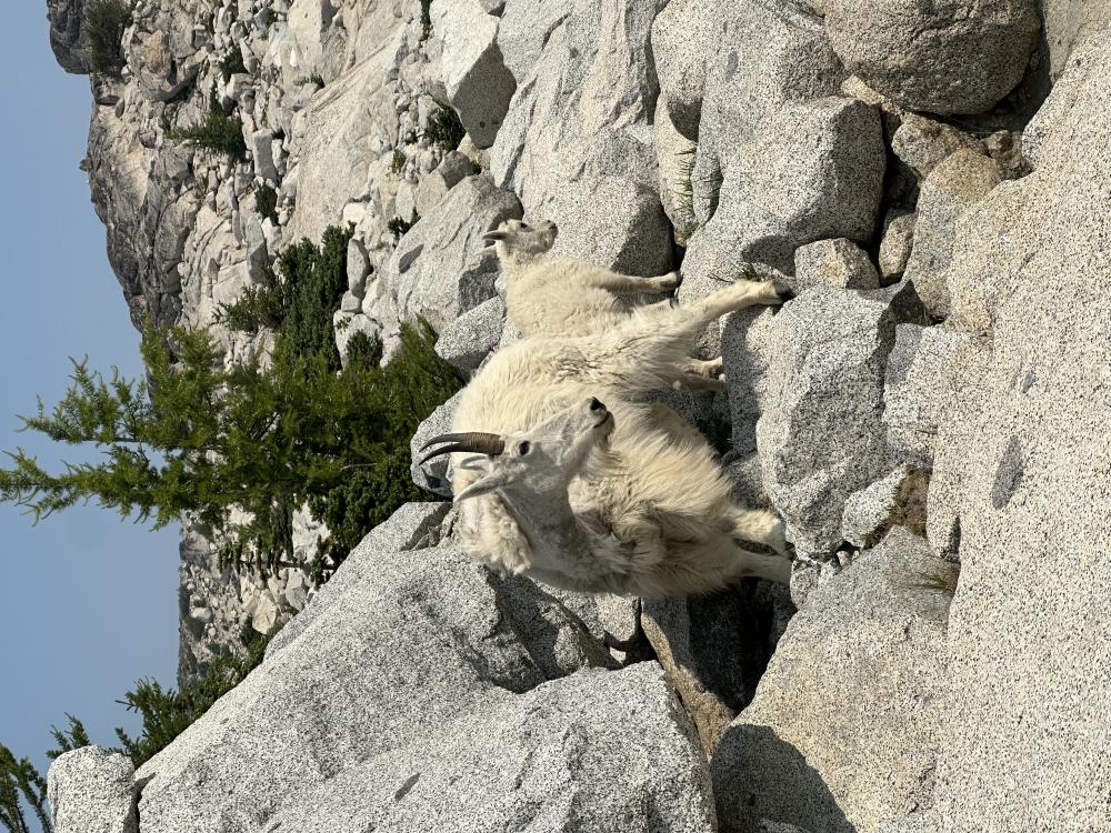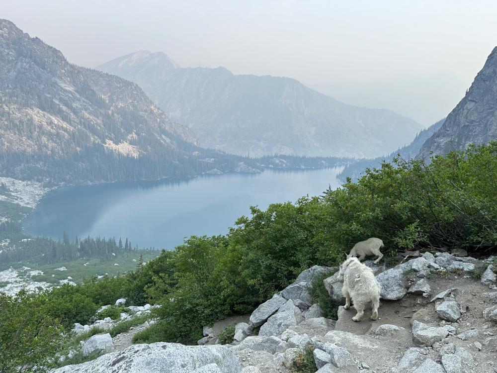 Oben angekommen, gibt es erst mal eine ausgedehnte Pause...für die Eltern. Die Kids sind immer noch voll fit und toben sich im Schnee aus. Die Sicht ist immer noch recht dunstig. Rauch riechen wir aber nicht mehr. Auch hier oben treffen wir wieder auf Mountain Goats. Die werden uns für den Rest des Tages begleiten. Immer wieder treffen wir auf Ziegen und Ihre Kitze. Vor den Mountain Goats wird hier übrigens gewarnt. Die sollen richtig wild auf Salz sein. Sie schnappen sich wohl gerne mal Kleider von Wanderer/Camper die zum trocknen aufgehängt/auf Steinen liegen und besonders gerne mögen sie wohl auch den Urin von Menschen und lecken den von Steinen und Erde. Uns lassen sie heute aber zum Glück in Ruhe und zeigen keinerlei aufdringliches oder gar aggressives Verhalten. Grosse Scheu kennen sie allerdings auch nicht - einen gewissen Sicherheitsabstand halten die Mütter, wohl auch wegen ihren Kleinen, aber schon ein.