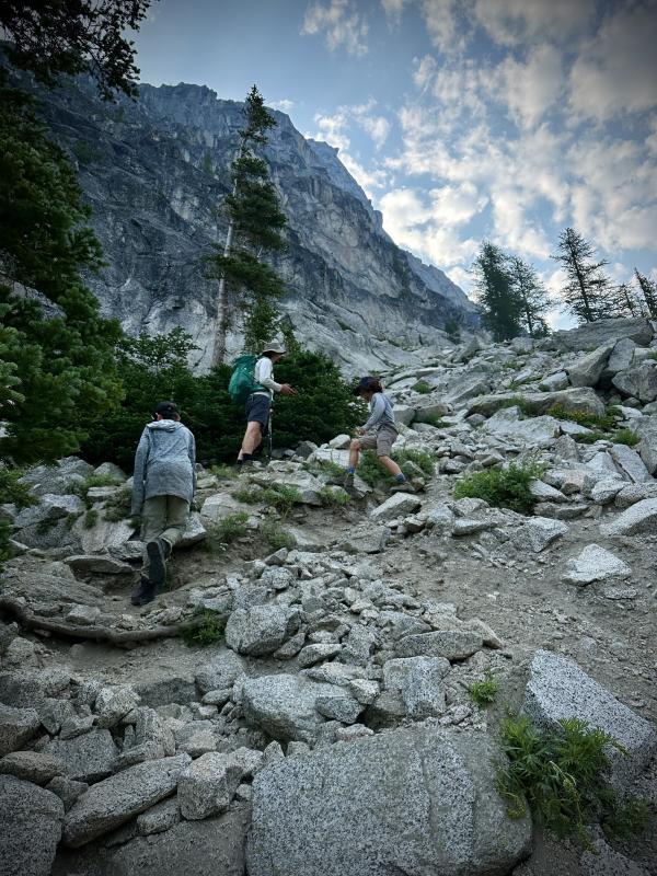 Auf geht’s ins Herz der Enchantment! Die Kids haben heute keine Rucksäcke dabei und so springen sie den Pass hoch wie jungen Mountain Goatswink Von denen treffen wir übrigens sehr bald die ersten - wieder eine Mutter mit Baby. Jetzt am frühen morgen liegt der Aasgard Pass noch komplett im Schatten und wir kommen gut voran. Aber es ist schon ganz schön anstrengend über Felsen und loses Geröll steil bergauf sich den Weg zu bahnen. Wir dachten anfangs, wir gehen ohne Wanderstöcke falls wir die Hände brauchen. Wir Eltern haben aber am Ende die Wanderstöcke meist doch ganz gerne genutzt. Unsere beiden kleinen Mountaingoats sind ohne Stöcke den Pass hoch gehüpftwink Mit ausreichend Pausen (für die Elternwink) schaffen wir es dann in rund 2.5 Stunden nach oben. Ich glaub unsere Jungs hätten es in deutlich kürzerer Zeit geschafft. Die waren heute morgen wirklich ausserordentlich fit und mussten ständig auf uns wartenwink Vielleicht liegt's am fehlenden Rucksack....ich denke bald kommt meine Zeit, wo Mama keinen Rucksack mehr trägt und das den Männern der Familie überlässtwink Die letzten 20-30 Minuten laufen wir in der Sonne und sind dankbar, dass wir so früh gestartet sind und nicht den ganzen Pass in der prallen Sonne hoch laufen mussten. Denn ist die Sonne erst mal da, gibt es hier absolut keinen Schatten mehr. Alles in allem war der Aufstieg nicht so schlimm, wie wir es erwartet hatten. Vermutlich hat uns Mount Saint Helens abgehärtet Den Aufstieg fanden wir deutlich anstrengender - war aber natürlich auch viel länger. Müsste man den Aasgard Pass nach dem Aufstieg zum Colchuck Lake bewältigen, sähe das sicher ganz anders aus (eagle eye wird ja vielleicht bald davon berichten...no pressurewink).