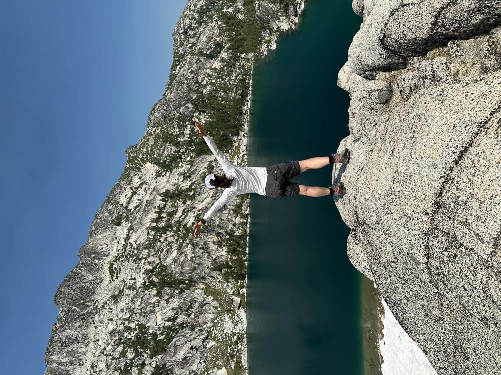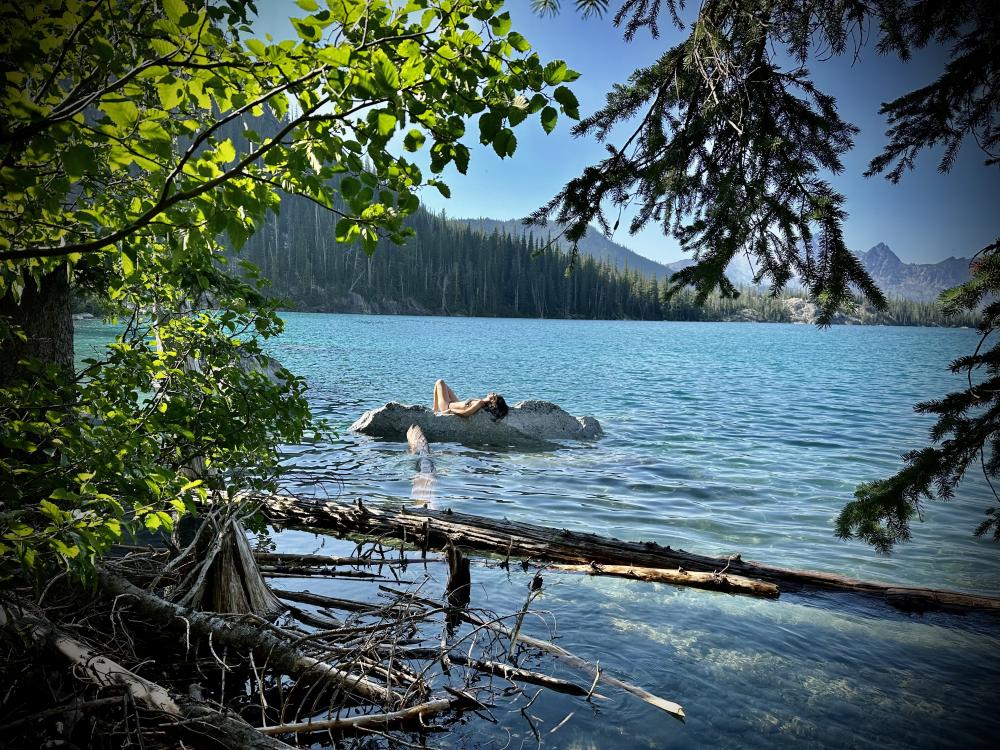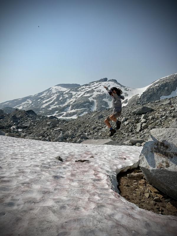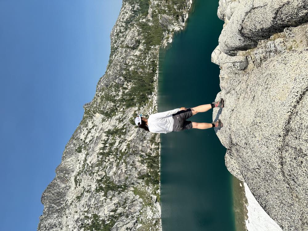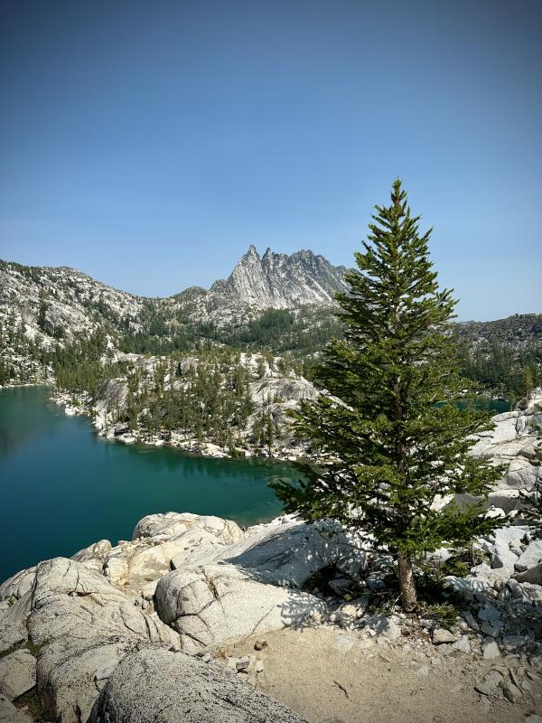 Wir wollen natürlich noch mehr vom Herzen der Enchantments erkunden und gehen weiter. Simply aaaaamazingheart Mittlerweile habe ich auch herausgefunden auf Alltrails (hab die Karte offline geladen), dass das nicht Inspiration/Perfection Lakes waren vorhin. Auf die treffen wir ein gutes Stück weiter. Einen traumhafter Blick haben wir von hier oben auf die beiden Seen. Leider streiken meine Männer und wollen nicht mehr weiter gehen. Um zu den Seen zu gelangen müssten wir hier steil nach unten. So weit wäre es eigentlich nicht, mindestens bis zum Inspiration Lake, der direkt unter uns liegt. Wir könnten sogar auf dem Schnee runter rutschen. Aber da ist nix zu machen…meine Jungs haben genug und der Blick von hier oben sei doch eh der Schönste. Nun ja, mich hätte es schon gereizt…….so herrlich blau und klar…da wär bestimmt auch ein Sprung ins kühle Nass drin gewesen, denn es ist ordentlich warm heute. Tja dann halt nicht und so machen wir hier oben im Schatten eines Felsen nochmal eine kurze Pause und geniessen diesen herrlichen Blick bevor wir umkehren. Wir müssen ja die ganze Strecke auch wieder zurück und vor allem den Aasgard Pass auch wieder runter. Davor graut mir jetzt schon…hoch ist die eine Sache…runter ne ganz anderesurprise