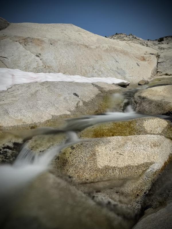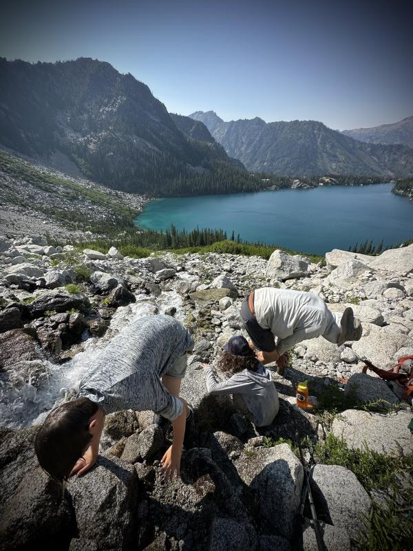 Mittlerweile ist es nach 15 Uhr und uns begegnen hier am Aasgard Pass immer noch Thru-Hikers...den Berg hoch...nicht etwa runter. Die wollen heute doch tatsächlich noch den ganzen Weg durch die gesamte Core Area und dann bis zum Snow Lake Trailhead wandern. Das sind von hier mit Sicherheit noch um die 20km…keine Ahnung was die geritten hat, erst so spät mit dem Hike zu startensurprise Ausserdem treffen wir auch Backpacker, die sich mit den grossen schweren Rucksäcken hier den Berg hoch quälen. Die Sonne ist gnadenlos und die Jungs und Mädels sehen ganz schön geschafft aus. Wir ermutigen sie. Dort oben zu zelten, dafür lohnt sich die Quälerei auf jeden Fallheart Gewinnt man ein Permit für die Core-Area, so darf man in den ganzen Enchantments zelten, also auch unten am Colchuck Lake. D.h. man kann so eine mehrtätige Wanderung planen und auch den Hike in die Core-Area mit einem Stop am Colchuck Lake oder wenn man von der anderen Seite kommt beim Snow Lake unterbrechen. Das wäre sicher auch ein Klasse Erlebnis…aber die Permits sind ja noch schwerer zu kriegen als unsere. Für die Core Zone werden täglich 24 Permits vergeben - allerdings an 24 Personen und nicht 24 Gruppen. Bei allen übrigen Backcountry-Zones werden die Permits an Gruppen vergeben - ich glaube für maximal 8 Personen pro Gruppe. Zurück zum Aasgard Pass. Es ist heiss und wir sind froh können wir uns weiter unten mal am Bach der hier runter fliesst erfrischen. Nach 2 Stunden haben wir es geschafft und wir sind zurück beim Zelt angekommen. Nichts wie raus aus den verschwitzen Klamotten und rein in den herrlich kalten Colchuck Lake….tut das guuuuutlaugh